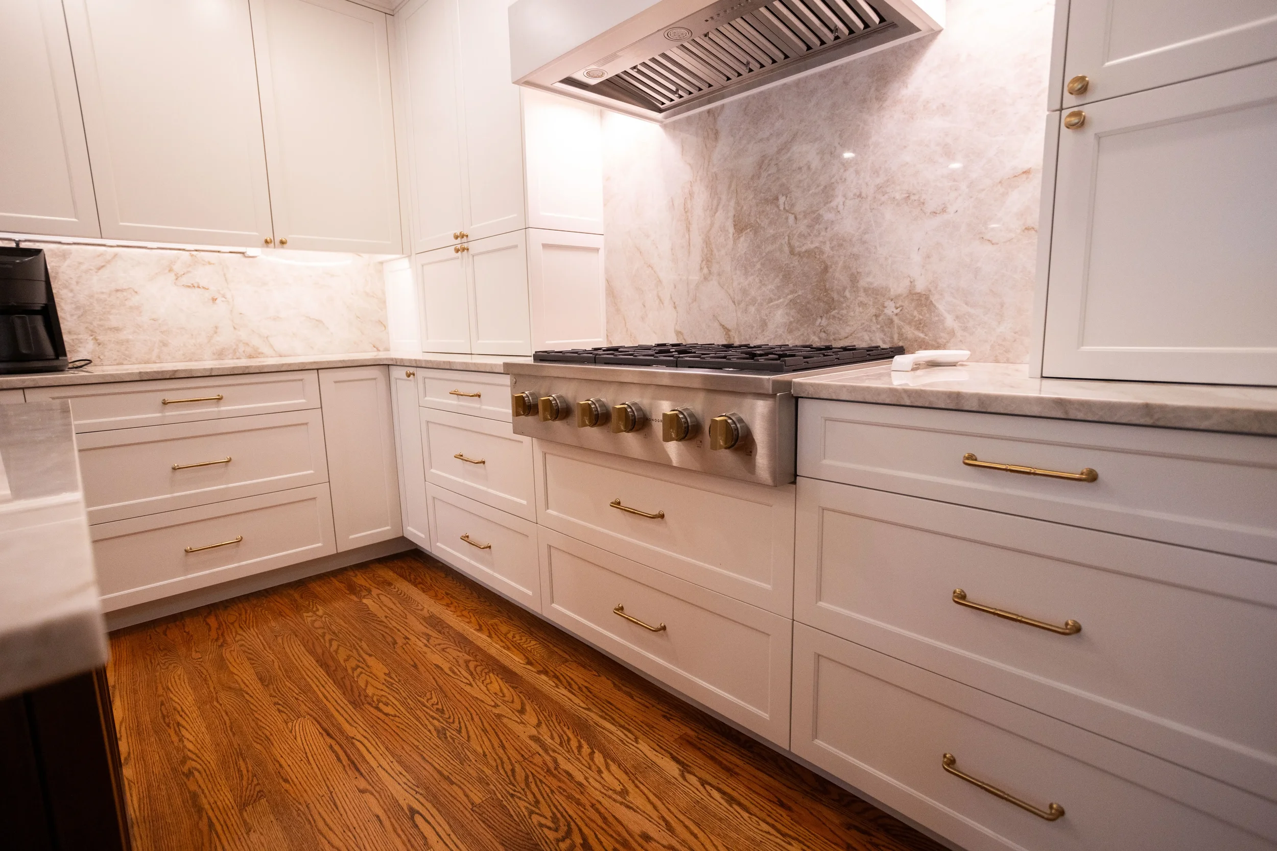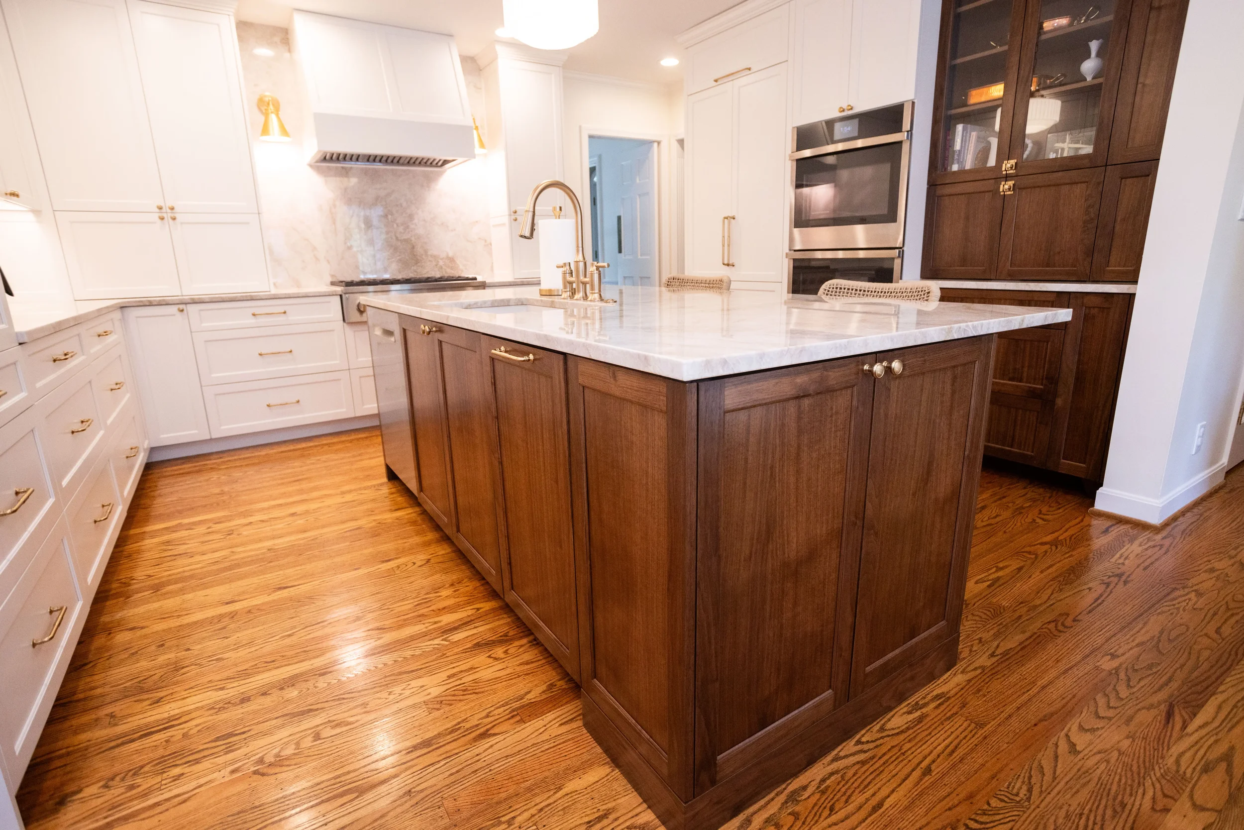 A timeless kitchen with contrasting white and walnut shaker style cabinets. Featuring a hidden built-in fridge and walnut built-in storage, next to the double stacked oven and pantry cabinet. Paired with brushed gold cabinet hardware.