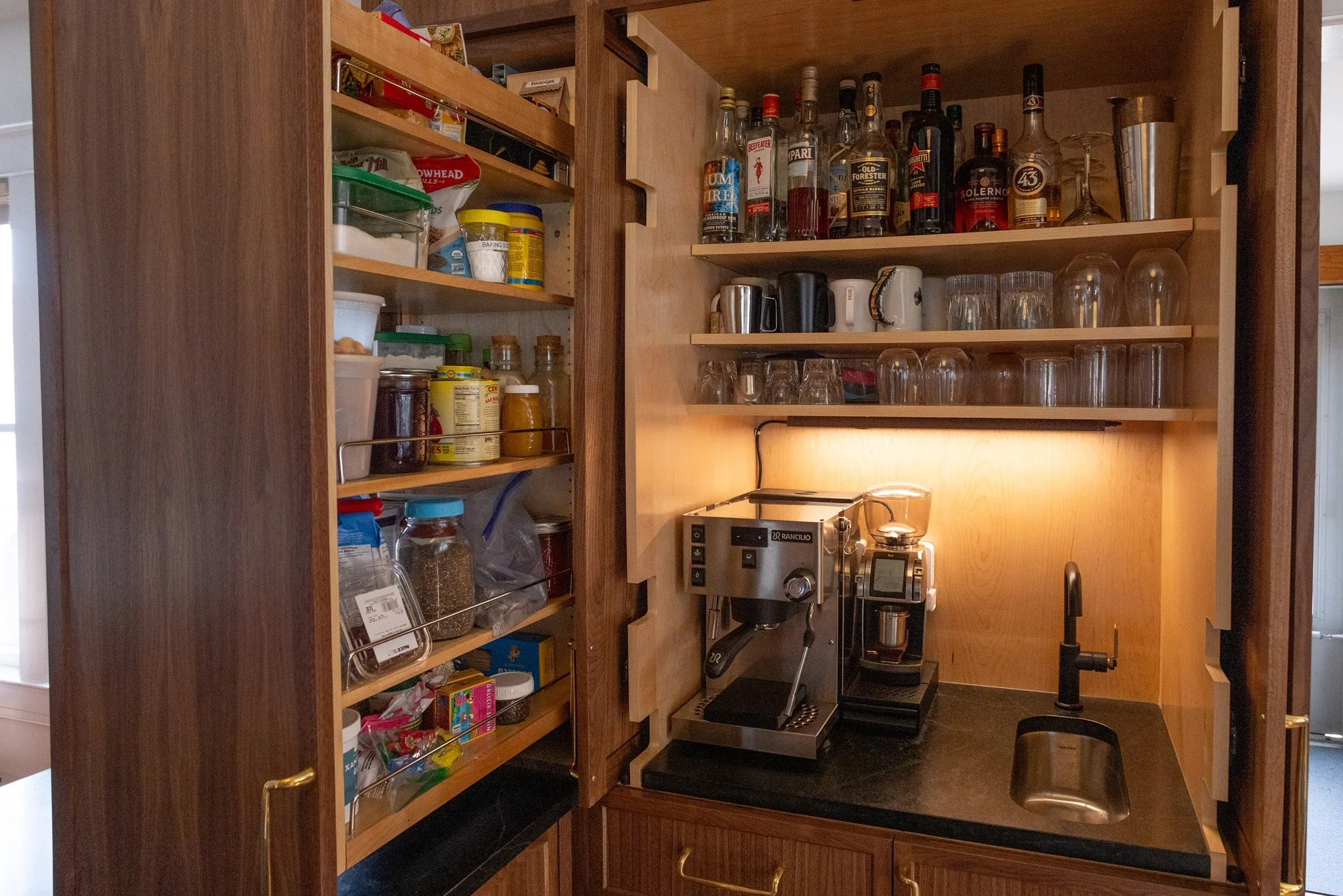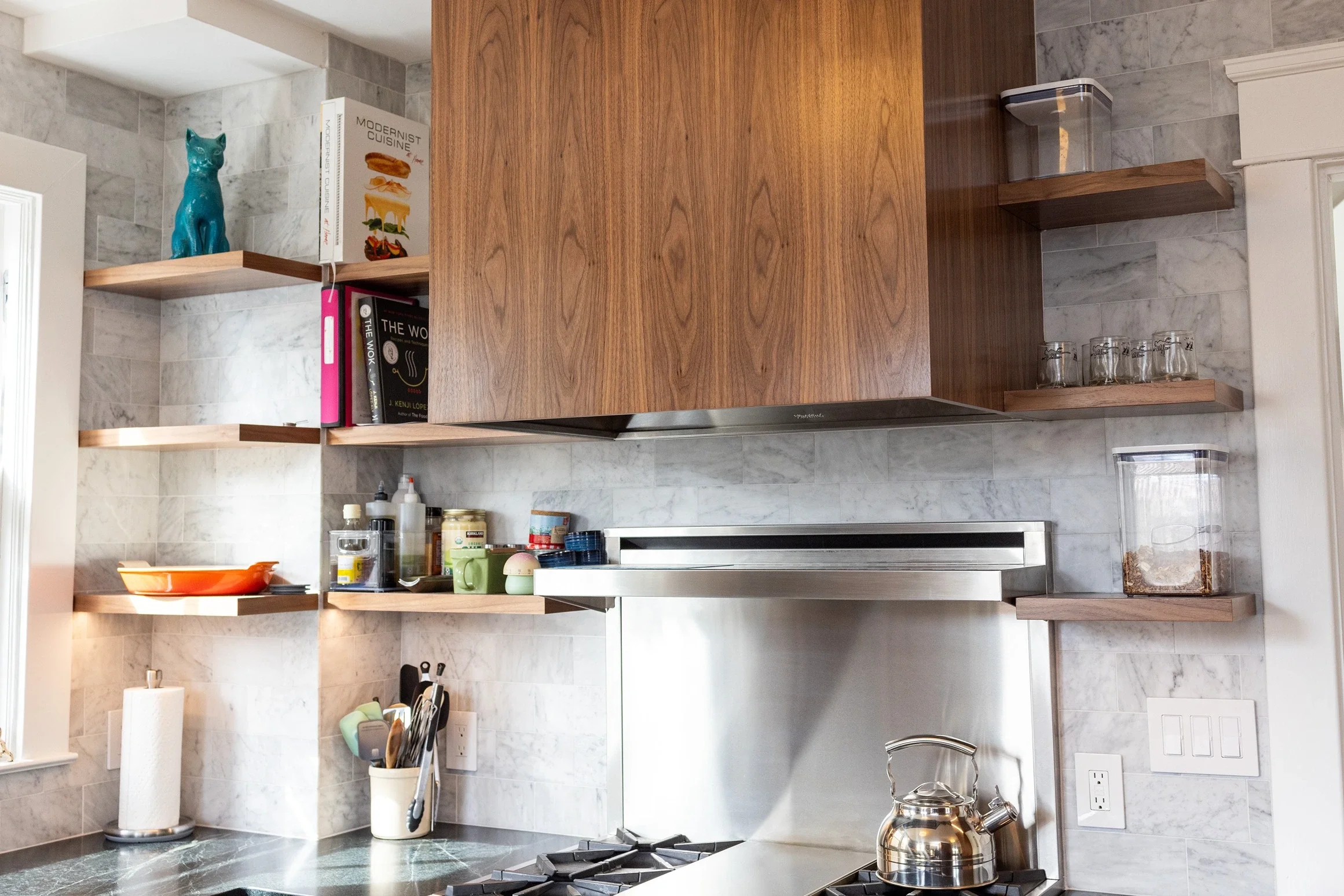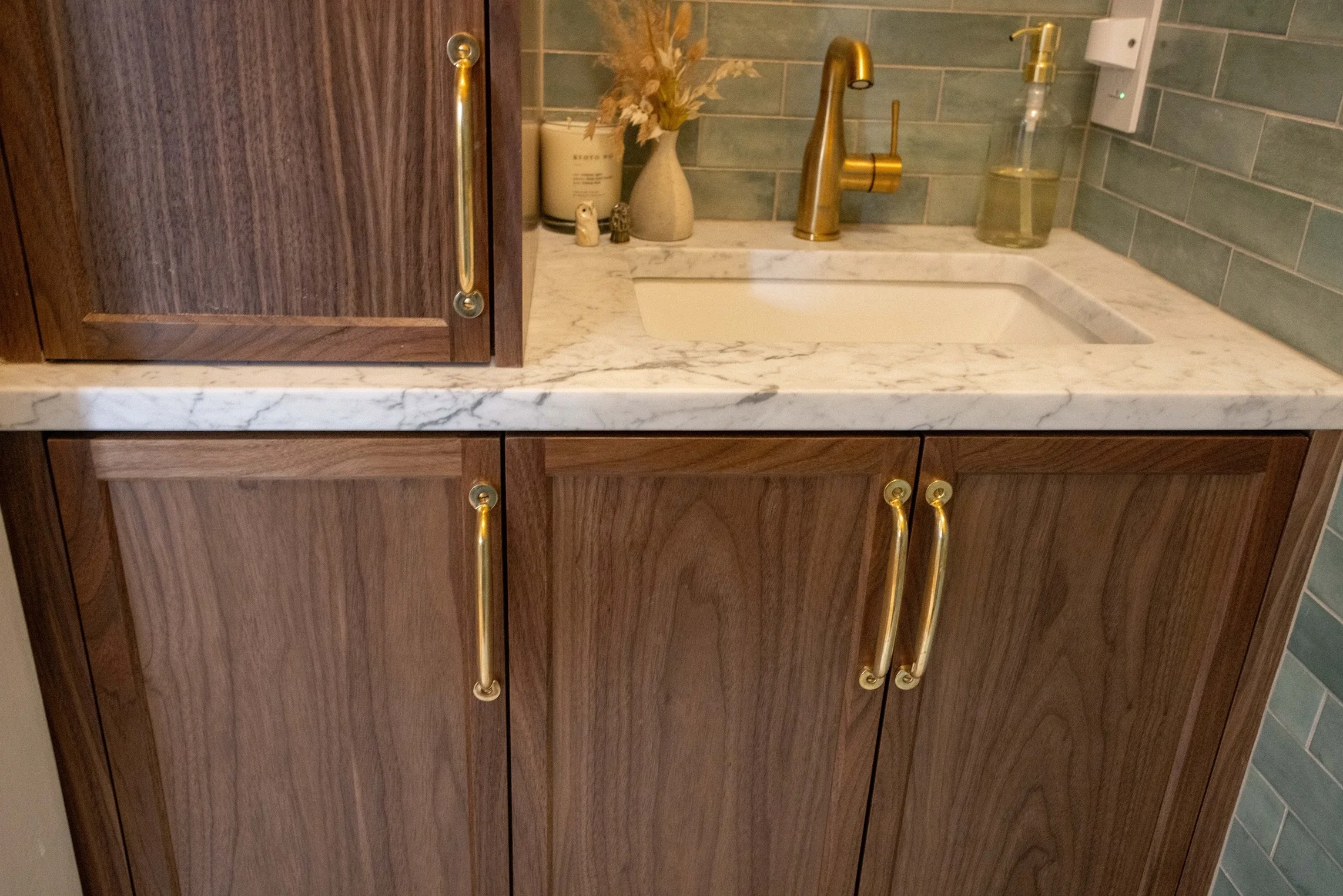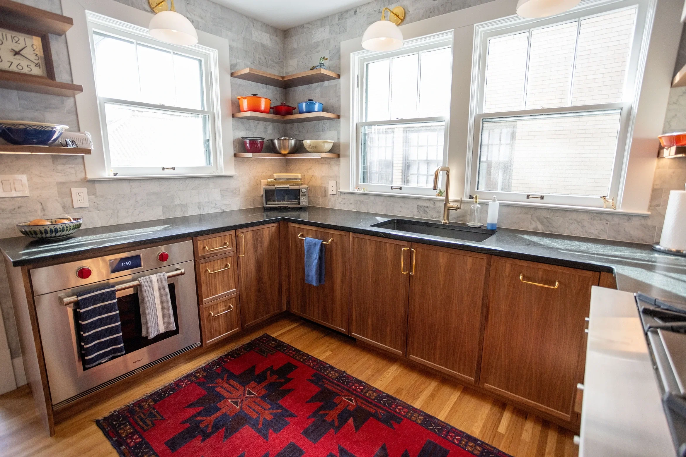 Located in the Heart of Louisville’s Highlands Neighborhood, and just steps from Restaurant Row, this charming kitchen was designed to host even your most extravagant Oaks & Derby parties. Featuring an inset frameless door style across a hidden fridge cabinet, pocket door coffee cove, pull-out pantry cabinet, floating shelves, a modern flat panel range hood, and gold brushed cabinet pulls.